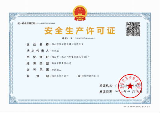 9月15日,佛山電建集團(tuán)有限公司下屬企業(yè)佛山市恒益環(huán)保建材有限公司(簡稱:環(huán)保建材公司)獲得住房和城鄉(xiāng)建設(shè)廳頒發(fā)的建筑施工類安全生產(chǎn)許可證。目前,環(huán)保建材公司已擁有“建筑業(yè)企業(yè)資質(zhì)證書(施工勞務(wù))”和“安全生產(chǎn)許可證”等重要資質(zhì),不僅說明了環(huán)保建材公司具備相應(yīng)的專業(yè)資質(zhì)與能力,也是環(huán)保建材公司技能水平提升的重要體現(xiàn),為其服務(wù)業(yè)務(wù)提供了更堅實(shí)的支撐。